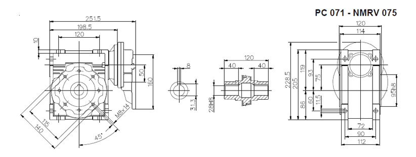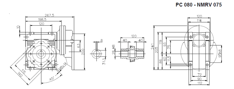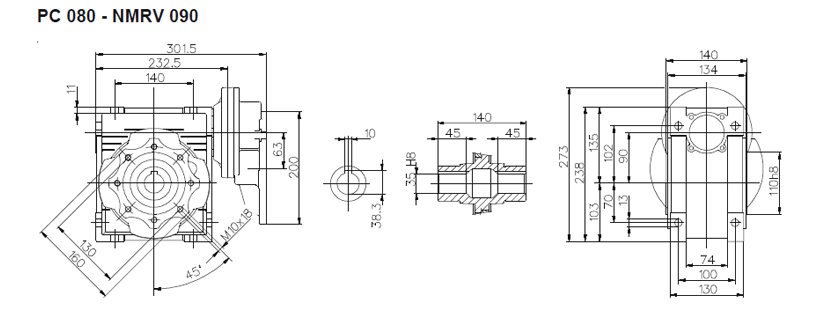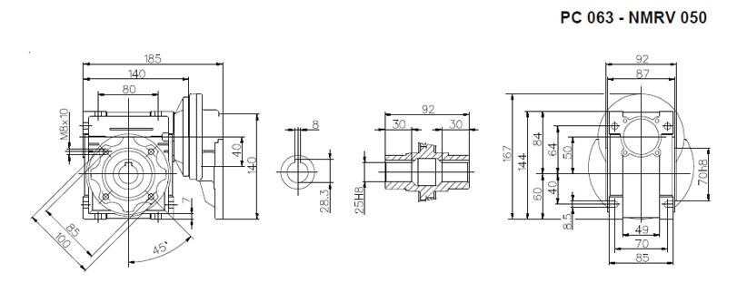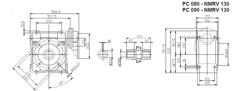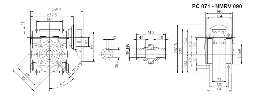 Цилиндро-червячный мотор-редуктор серии PCRV состоит из червячного редуктора NMRV и цилиндрической ступени PC. В отличии от редукторов NMRV цилиндрическая ступень имеет только одно значение передаточного отношения (3,5). Ступень PC поставляется в четырех типоразмерах: PC 63, PC71, PC80, PC90. Ступень устанавливается между электродвигателем и редуктором и позволяет получить диапазон передаточных чисел 75 – 320. Корпус из алюминиевого сплава. Шестерни выполнены из закаленного сплава 20MnCr5 (UNI7846).