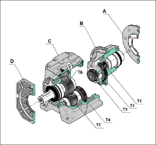 - C - цилиндрические передачи второй и третей передачи (T4, T5) заключенные в монолитный корпус редуктора